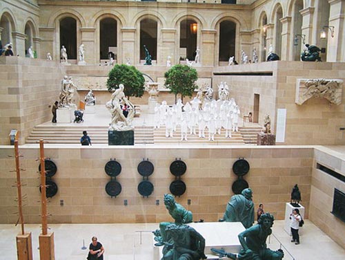 卢浮宫将来自世界各地的艺术珍品分别展出在六大展馆中,即东方艺术馆、古希腊及古罗马艺术馆、古埃及艺术馆、珍宝馆、绘画馆及雕塑馆。其中绘画馆展品最多,占地面积最大。卢浮宫区有198个展览大厅,最大的大厅长205米。
