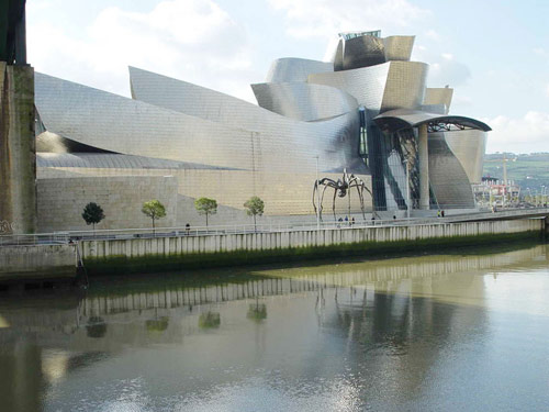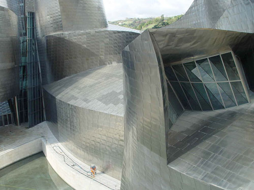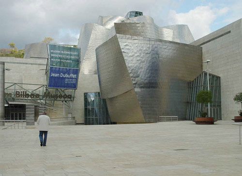 西班牙毕尔巴鄂古根海姆博物馆(the Bilbao Guggenheim Museum)由美国加州建筑师弗兰克·盖里(FFrank O.Gehry)设计,在1997年正式落成启用,它以奇美的造型、特异的结构和崭新的材料立刻博得举世瞩目。在20世纪90年代人类建筑灿若星河的创造中,毕尔巴鄂古根海姆博物馆无疑属于最伟大之列,与悉尼歌剧院一样,它们都属于未来的建筑提前降临人世,属于不是用凡间语言写就的城市诗篇。