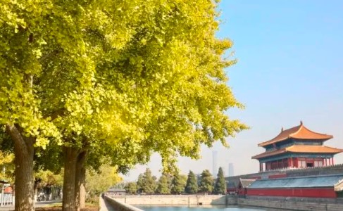 但北京也有另一面。金灿灿的银杏树掩映下,故宫角楼的红墙黄瓦——