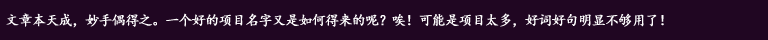 NO.8一目了然 | | | 有一些项目名称起得非常简单,但能够很直接地表达个中含义,引用前段时间比较流行的一个词——接地气。 |