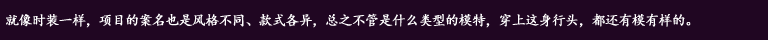 NO.6无厘头 | | | 相对于其他风格的项目名称而言,有些项目的名字实在难以理解,无厘头风格尽显。也许,是希望被人们牢记,也许,也会事与愿违。 |