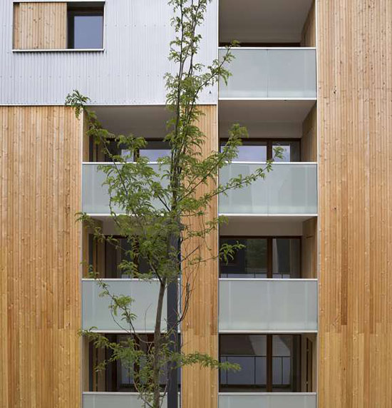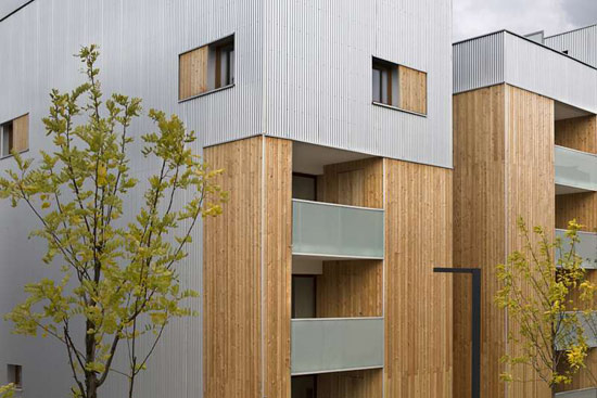 沿街一侧的建筑有助创建邻里建筑的不同高度轮廓线。所有住宅对着走廊开放,能俯瞰美丽的中央花园。住宅单元的布局优化,有助提供宽敞的主要生活空间。毗邻走廊设置的储藏室为租户提供额外的储存空间。设计关注细节,金属的表皮,笼子状的、极具工业感的梯子和灯具与暖调的门窗木框、走廊形成对比。