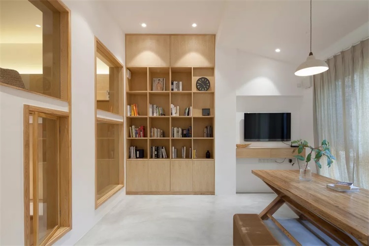 改造后的公共空间宽敞明亮。实施了通高书柜,卡座,小院翻新等改造动作。