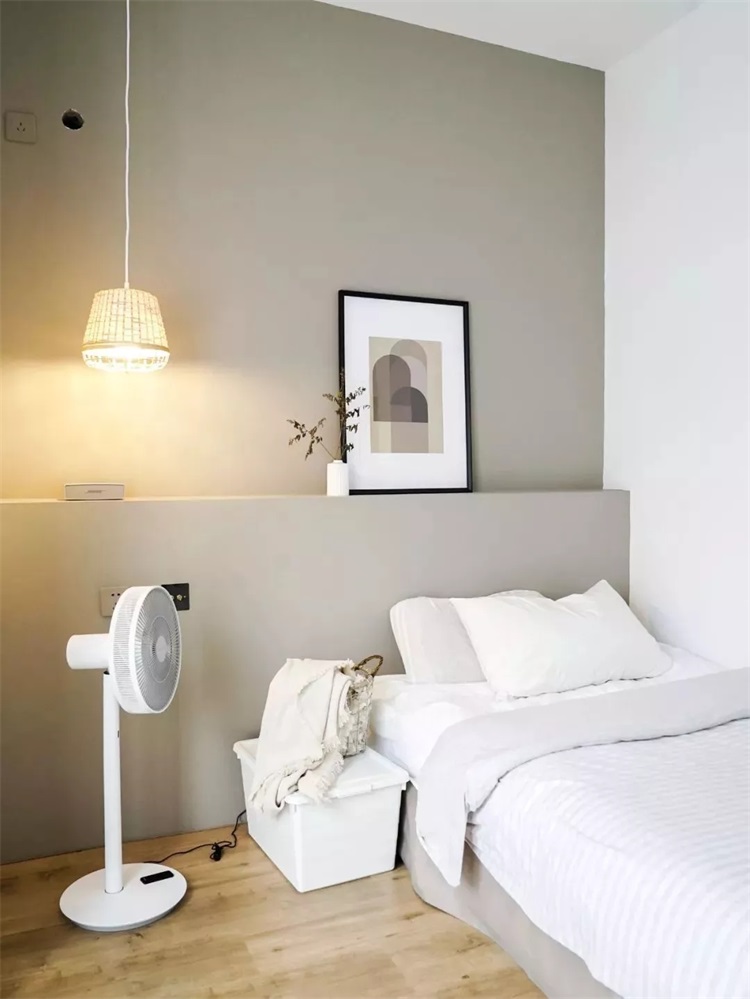 二楼詹颖的卧室有中式抽屉柜,其他装饰是北欧风格。朋友软软的卧室,偏暖调的白色安静且温馨。