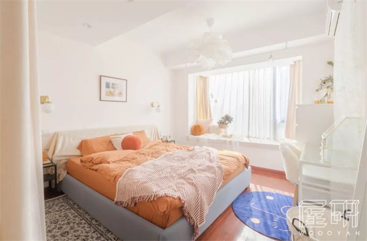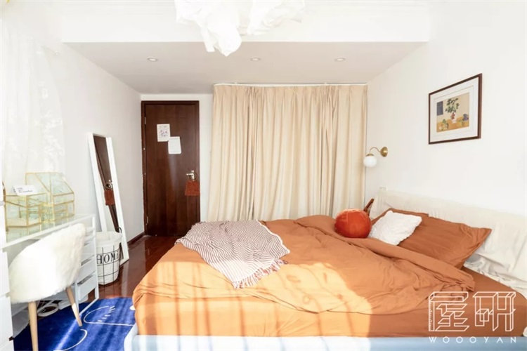 和整体风格调性最相关的就是色彩了:卧室用了和地板颜色最接近的“暖色系”,比如棕色、驼色、奶白色。