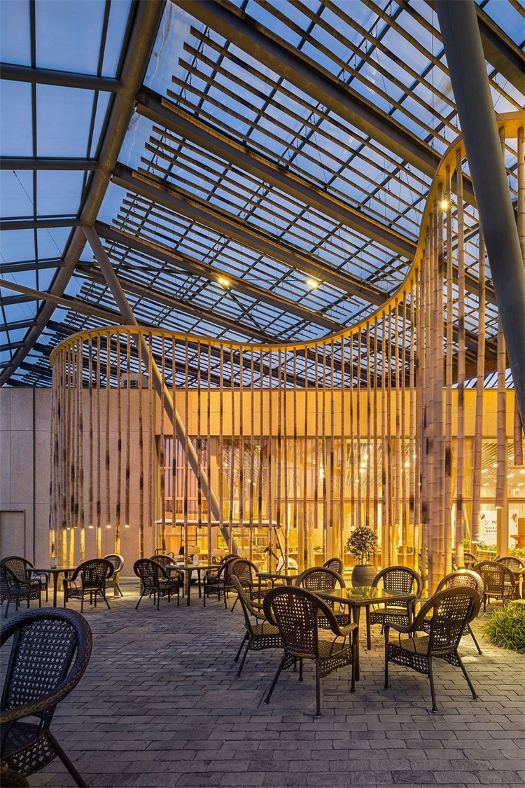 建筑整体呈不规则的三角形形状,建筑体在视角上展开,使大讲堂拥有一个室内外融和的灰空间而非成为园区内的视觉阻碍物。与此同时,建筑用地轮廓响应三角形的斜边,上下以竹子连接,形成交叉的双曲面造型,旨在贯通视线,形成一个通透的空间,给人以强烈的场域感。这样,不论从哪个角度看,大讲堂都有其造型特征,但又不会显得喧闹夸张。
