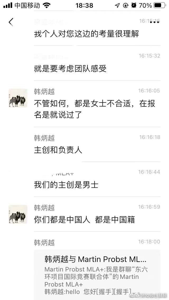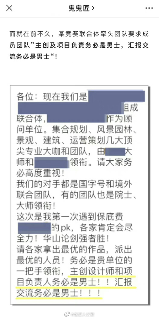 昨日,一则涉及性别歧视的博文引发热议。微博博主“lover_慧轩”透露,中国城市规划设计研究院风景园林和景观分院副院长韩炳越在聊天截图中,毫不掩饰其性别歧视倾向:要求北京东六环竞赛项目合作伙伴——荷兰MLA建筑事务所的相关主创、负责人、甚至汇报人员都务必是男士。