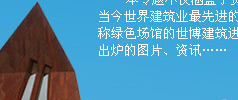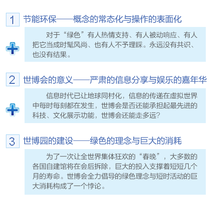 上海世博会提出“低碳世博”的理念,确定以“低碳、和谐、可持续发展的城市”为主题,并将实验室里日新月异的科技梦想“转化”为“节能、环保、可持续发展”的现实生活,为每一个“城市人”未来的日常生活展示了美好前景,但事实上绿色场馆大多只是表象,真正的绿色建筑少之又少,就连世博会上还是有很多的“伪绿色”……本部分将围绕绿色做文章。