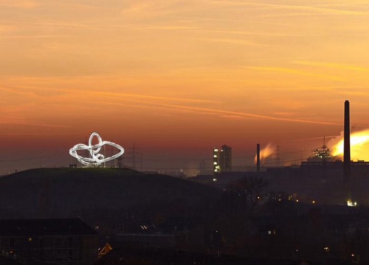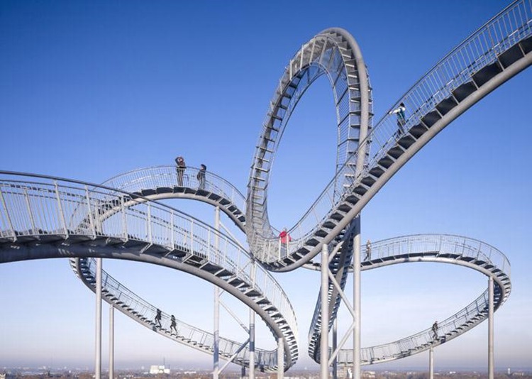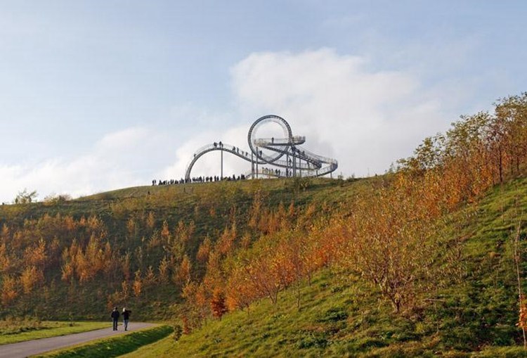 2011年11月13号起, Heike Mutter与Ulrich Genth的作品“老虎与乌龟——魔山”面向公众开放。这个造型动态的人行过山车位于德国杜伊斯堡南部的Heinrich Hildebrand Hohe公园的最高点。游客可以在上面攀爬,作品被抬升了21米。但你想要把中间的圆环造型部分也走一遍那是不可能的。人们能够在作品最高处,离地45米的高空获得观赏西鲁尔区的非凡视野。这个作品辩证的表达了当地发展过程中的困境以及其应该寻求重生与重组。过山车的形象代表着荒诞与扭曲,但它有力的深入人心。荒谬又怎样,矛盾又怎样,拒绝给出看似明确其实断然的答案。这个作品占地44米乘以37米,高度21米,可谓工程学的杰作。即使在三维空间中,每一个接触点都会不一样,但还是实现了楼梯与通道优雅的结合。