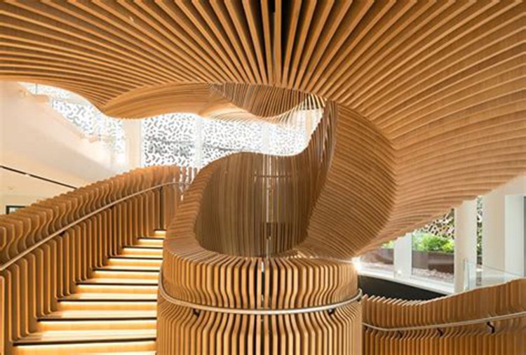 法国设计师Ora Ito通过切割,将400余片木板组装成阶梯,这座木制阶梯嵌在法国路易威登集团的办公室内,蜿蜒向上,凸显了室内环境的奢华。