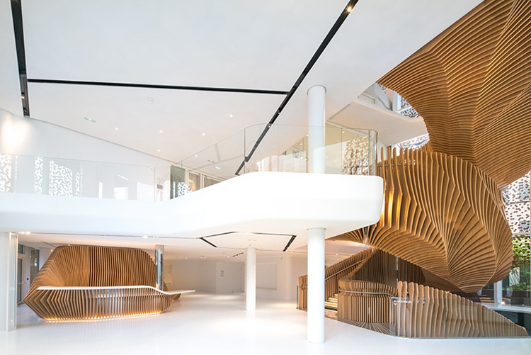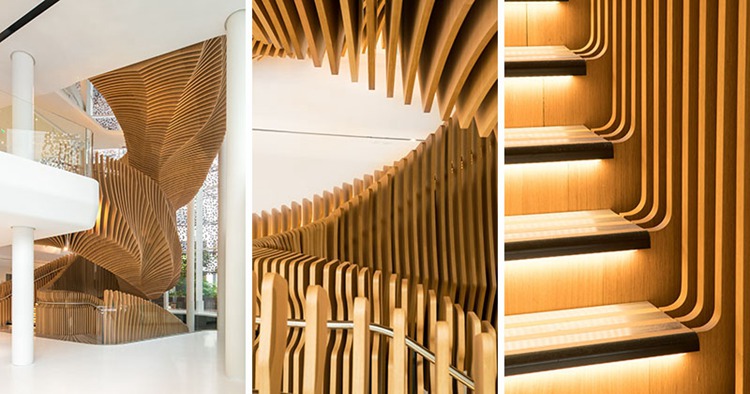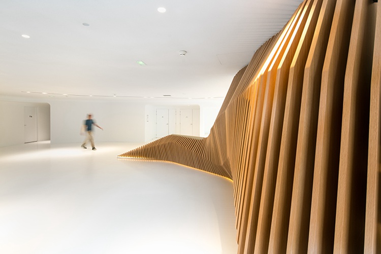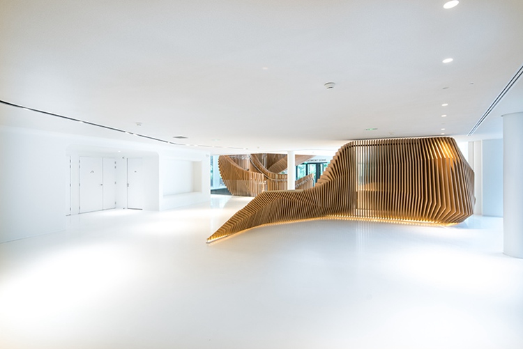 这座阶梯蜿蜒向上,由429块木条构成,贯穿整座办公楼上下四层。楼梯踏面结构的底部和两侧的扶手也是由木条组成。弧形木条的边缘处理体现了极致的细节,这些木条整齐并列地搭建起来,形成波浪形的锯齿状。