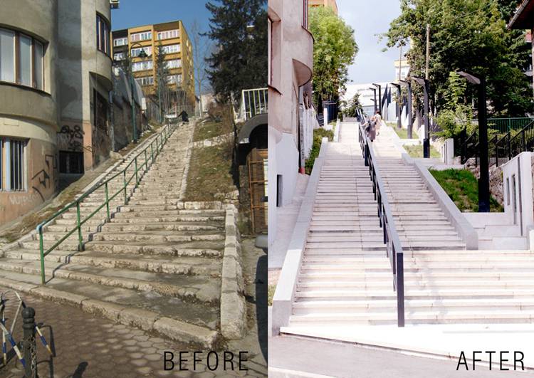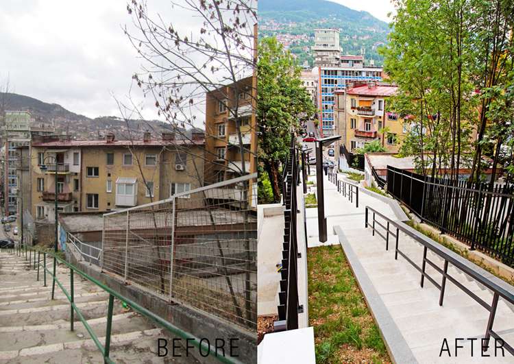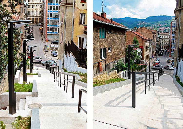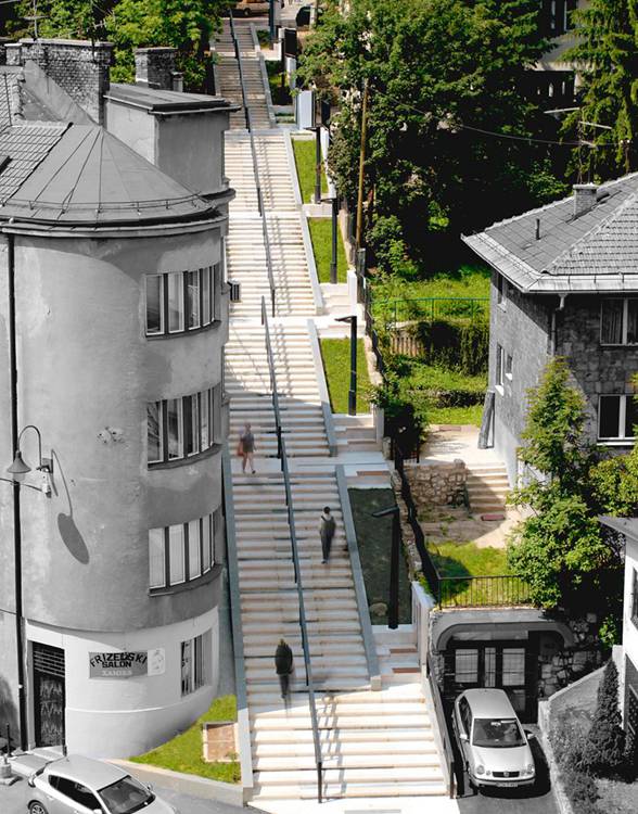 这段俯卧在波斯尼亚首都萨拉热窝山上的长梯是向当地著名诗人致敬和缅怀而建。满足基本的交通职能外,这长阶梯展示出作为城市公共空间的独特面貌,一共120个台阶,共7个停留梯段。人们可以在停留梯段止步,回望城市美景,诵读刻在一旁的诗句。丰富的空间序列及内容随着进程富有层次的展开,难以忘怀。阶梯主材为石材,石材的娴熟巧妙运用将意图表达更为完整得体。