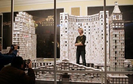 据英国《每日邮报》报道,美国建筑师贝格是之前吉尼斯世界纪录保持者,他此次在澳门威尼斯人度假酒店成功打破自己之前保持的“世界最大型扑克牌建筑”的吉尼斯世界纪录。