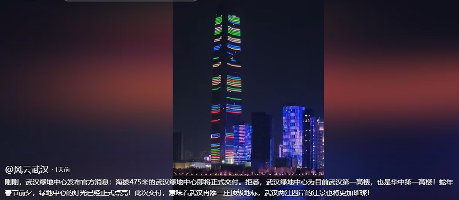 华中第一高楼/武汉绿地中心于2011年7月开工,2020年9月封顶。
