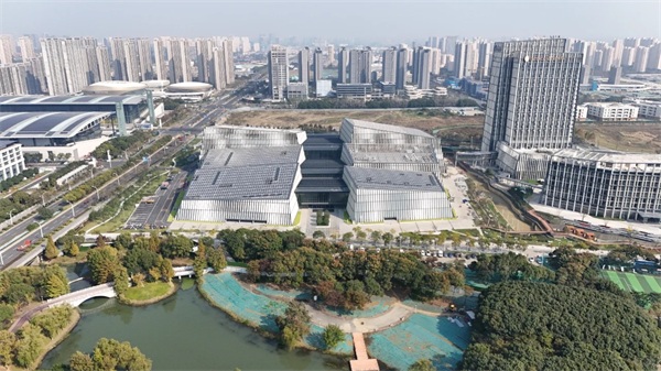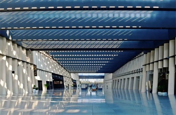 屋面采光顶搭载晶硅光伏绿色建材,铺设占顶面积40%。该高透光晶硅产品外观透亮,既能满足建筑美学和采光需求,还能实现高效发电,提高建筑设备及系统的能源利用效率。