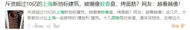 同样是螺旋造型的上海“蚊香楼”不久前成为热门话题。该造型据说是为了致敬特斯拉线圈,也呼应了业主身份:华东电力设计院。