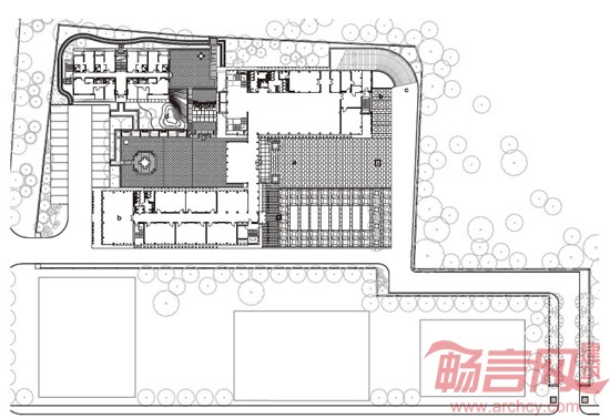 建筑形态通过水平密檐寻求中国古典建筑的相关性,正面的中国建筑形态特征体现在水平向的延展,侧面关注垂直向度上的重叠,寻找与泰国寺庙建筑的相关性。而这一形态的根本出发点是对当地湿热气候的回应。
