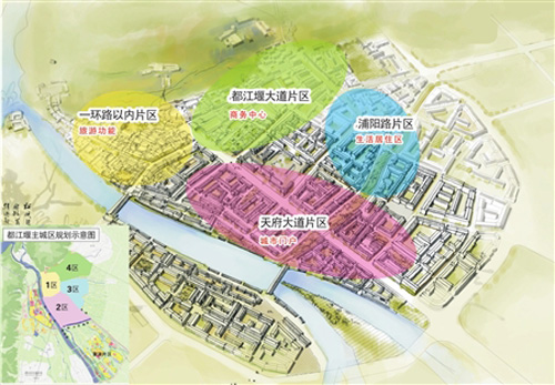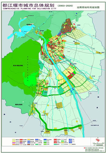 都江堰重建规划中提出“一心四轴,轴向发展,指状延伸”的城市空间格局,中心城区空间发展策略将围绕内江分支地段的空间展开,我们把沿四条河渠两侧的重建街坊作为城市空间和景观控制带的重点,在分条分段控制的基础上,突出营造各自的景观特色和主体功能。各条发展轴的功能定位和景观引导以轴线之间的五条指状片区的功能为依据,而轴线在向城区外延伸的过程中,逐渐与田园原野融合到一起。同时,这四条开放空间通道也将同时成为重要的防灾通道和旅游景观通道。这样,中心城区的规划结构就呈现出“一核、三片、四心、八带”的特点。“一核”指一个都市公园。都市公园位于都市旧城向南发展与生态走廊交叉点,这样既能限制旧城向外蔓延,又能成为向南发展聚源新区的空间联系点,是未来都江堰中心城区绿化的核心与一处特色公共空间。按照自然水体和生态廊道划定的线路,规划中都江堰中心城区分为旧城、聚源、玉堂“三片”区。“四心”指建设路以内旧城商业、城铁站商业核心和聚源新区公共活动中心,二环路行政文化中心。这样下来,中心城区自然就被分成商业、服务业、旅游业等特色各异的八条发展带。