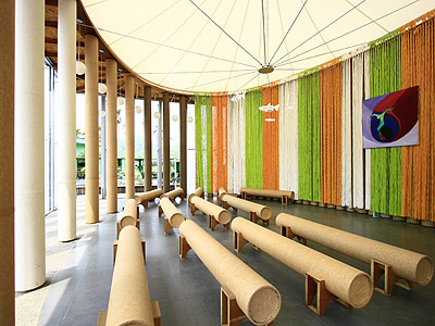 纸教堂原是一九九五年阪神大地震之后,坂茂为烧毁的神户鹰取教会所设计。当时开始着手研究纸建筑的他,以五十八根纸管做主结构,动员三百名义工搭成椭圆形的新鹰取教堂。这座纸教堂便于拆卸、移动与重建,符合新世纪的环保概念与游牧精神。