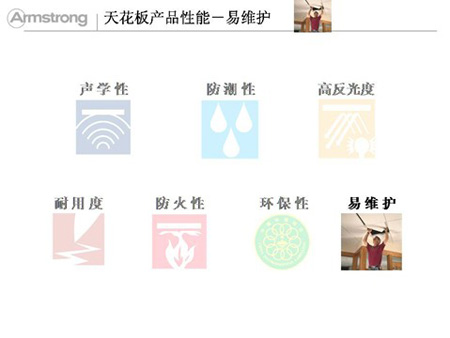 防潮性能:只有防潮性能好的产品才能有效的防止下陷。阿姆斯壮产品在防潮性能方面具备以下几点优势,第一,阿姆斯壮普遍增加了板材的厚度,如常见RH99板的厚度为16mm;第二,阿姆斯壮产品的自重在与同类行业的比较中是很有优势的;第三,阿姆斯壮具有背层抗垂涂料专利技术,确保板材的平整度,并且具有优良的抗下陷能力;第四,阿姆斯壮矿棉板配合龙骨系统使用最高享有30年品质保证。