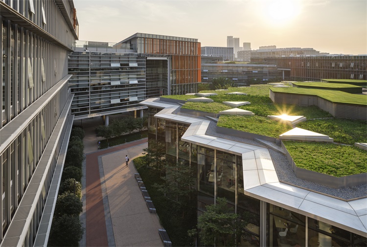 Take the Alibaba Xixi Campus Phase 4 as an example. The award-winning project is comprised of big and small hexagon-shaped cells in the planning and design to enhance connectivity. After entering the campus, employees can choose to bike or walk to their destinations. Shared spaces on the ground floor provide strong east and west connections to encourage employee moving between courtyards. Each workstation is 60 seconds or less from outdoor green spaces, including rooftop gardens and terraces.