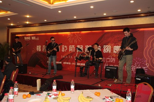 尹臻:在组建乐队的最初阶段还是有一些遗憾的,包括2009年的那次演出。遗憾的原因是总是不能保证人员齐整,总会有一个或者两个乐队成员不是CCDI的员工。直到2011年CCDI颁奖盛典之前,人员依然不齐整,我们始终没有鼓手。这时候我们以前的主音吉他手王禄主动提出要学打鼓,现在他的水平已经练得很不错了。在颁奖盛典开始的时候,尽管赵小钧总经理对我们没有要求,但我们对自己是有要求,那就是所有参加演出的人员必须都是CCDI的员工,我们在这次颁奖盛典上做到了。当然,这其中也克服了很多困难,包括我们一直也没有吉他手,鼓手是客串的,另外就是异地合练的机会非常少。后来我们北京公司的乐队成员专程去了一次上海排练。当时上海非常热,大家在潮湿的地下室排练,条件很艰苦,每排练一次几乎都是三四个小时,出来的时候衣服基本都湿透了。但是我们还是特别认真、特别开心,只要有时间,大家都是每天必练。如果排练时缺一个人,那么我们就用电脑把他的那部分放出来。在演出前,我们也是提前一天到上海开始合练。虽然这些都是利用闲暇时间来玩儿的事情,但大家都是非常认真对待的。这一点我很感动,也很感谢大家。