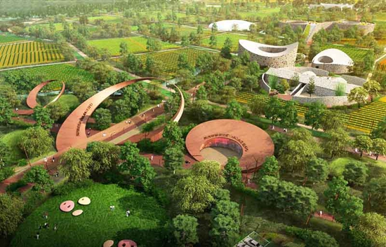 项目的设计理念来源于葡萄的自然几何形状,主次路像葡萄的主干和枝蔓一样穿插在一起。核心主轴线是一个蜷曲的葡萄藤蔓抽象延伸而成,整个园区多以圆形元素为主,道路和建筑都可以看作一个生长围绕葡萄形态而展开的元素构成,建筑物作为这一元素,构成与景观道路一起能够在空间上延伸起伏,形成高低绵延而又相互连接依存的艺术效果,灵活多变而又满足功能需求,并且突出园区主题。