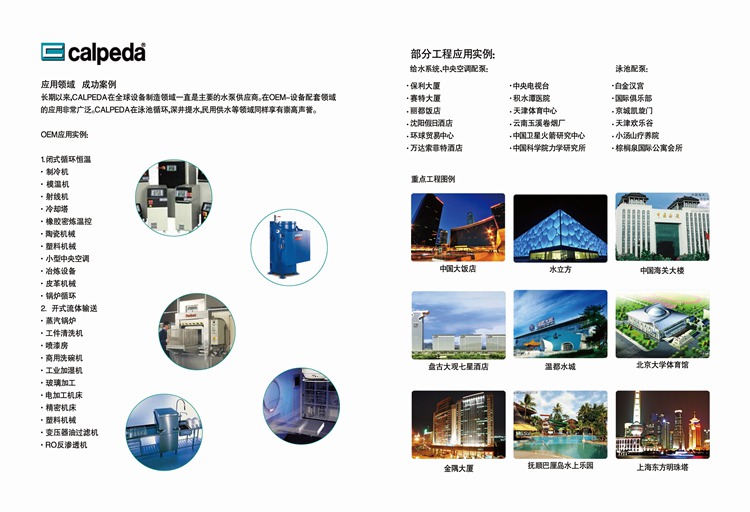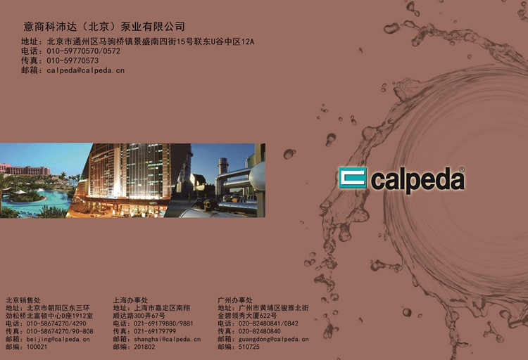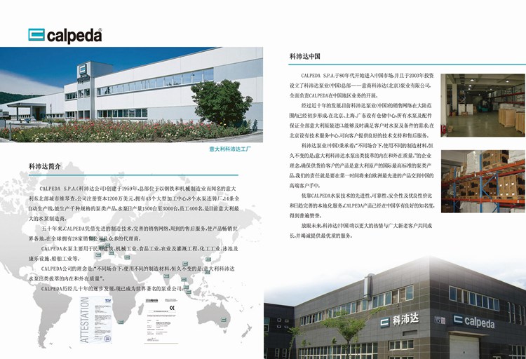 科沛达公司创建于1959年,历经几十年的逐步发展,现已成为世界著名的泵业公司。科沛达公司总部位于以钢铁和机械制造业而闻名的意大利东北部城市维琴查 (VIC ENZAR),下设有一个科研发展中心,八个水泵制造厂, 一个铸造厂及数家控股制造公司,能生 产近千种规格的泵类产品,员工近千名。科沛达公司在全世界拥有28家销售公司及众多的代理商;其高质量的泵类产品,先进的制造技术,完善的销售网络,周到的售后服务,使其产品畅销世界各地数十年,年产量在百万台以上。 科沛达泵业(中国)秉承着:“不同场合下,使用不同的制造材料,恒久不变的是:意大利科沛达水泵出类拔萃的内在和外在质量。”的企业理念。确保供货给客户的产品是意大利原产的国际最高标准的泵类产品,我们的责任就是要在第一时间将来自欧洲最先进的产品交到中国的高端客户手中。 科沛达产品的应用领域极其广泛,主要用于民用建筑工程;机械钢铁工业;食品工业;农业及灌溉工程;游泳池及康乐设施;普通民用;化工; 船用等领域 科沛达泵业(中国)成立后,其销售网络在中国范围内已经形成,中国境内在北京;上海;广东等地设有仓储中心,能够及时满足客户对水泵及备件的需求。并成立有技术服务中心,可向客户提供良好的技术支持售后服务。依靠CALPEDA水泵技术的先进性、可靠性、安全性及优良的质量—价格比和日趋完善的本地服务,CALPEDA产品已经在中国享有良好的知名度,得到普遍赞誉。