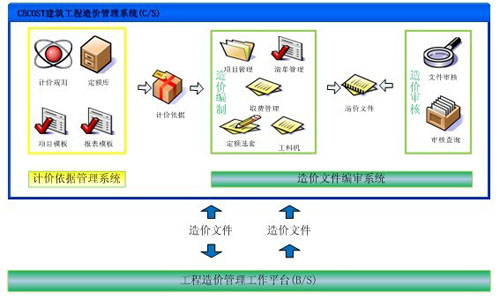 造价工作平台像一条纽带,把各个单机编审软件有序联结。系统通过B/S架构的造价工作平台进行统一的组织机构维护和用户管理,控制造价文件的上传和下载。同时维护C/S软件版本和计价依据组件版本,控制版本升级和发布。