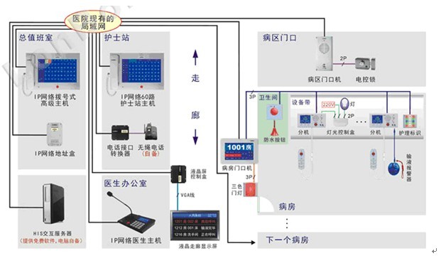 病床呼叫对讲:病人可通过床头分机呼叫护士站主机及病房门口机,护士站主机有免提和全双工听筒两种通话方式,病床分机呼叫时,护士站主机有语音播报,并能显示呼叫信息,病房门口机可同步显示呼叫信息。