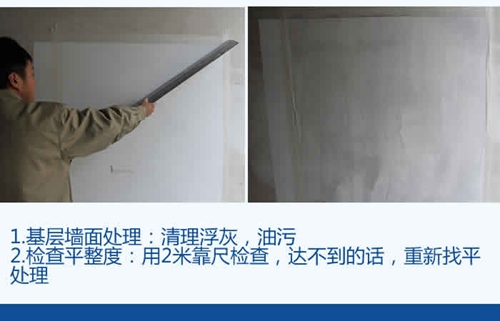 1、基层处理:墙面应干燥,无浮灰油污等妨碍粘结附着物,表面不得有粉化、起皮、爆灰等现象。抹灰层达到中级抹灰标准,阴阳角垂直。
