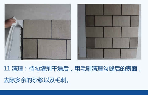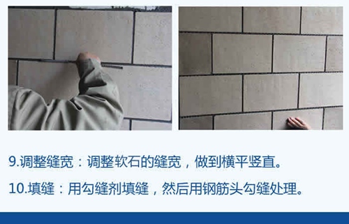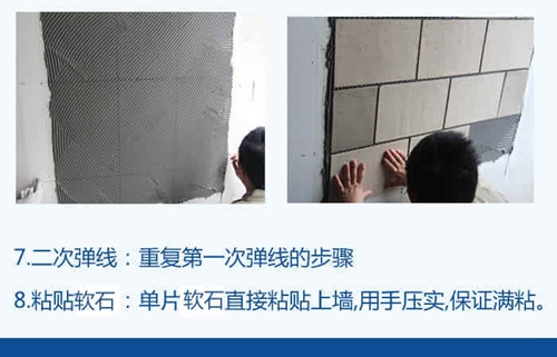 4、粘贴仿石板:将搅拌好的的胶粘剂用点粘法布在板的背面并粘贴在墙体上,用膨胀螺丝将板材固定在墙上。