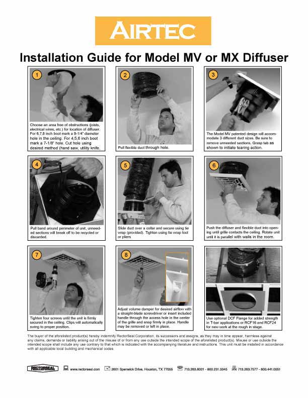 Rectorseal 天花板散流器适用于住宅及商业建筑应用领域,目前产品型号分别为8''*8''长方形(MV-2,3,4型)以及8''圆形(MV-360)。产品设计考虑到了安装的省时省力性,天花板下只需一人,即可完成。