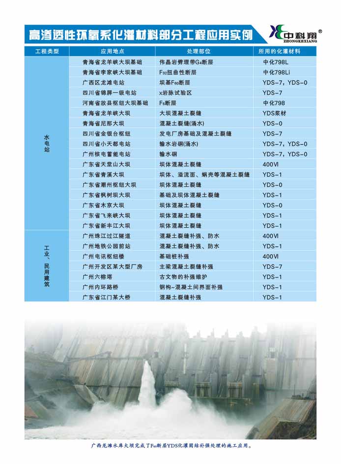 该板块是以中科化学在化学灌浆材料领域几十年的技术研发为积累,依托控股公司-中科院广州化灌工程有限公司,以自主研发的先进灌浆及防水材料为基础,结合先进的工程施工技术和工艺,服务于国家水利、电力、高铁和地铁等大型国家工程。