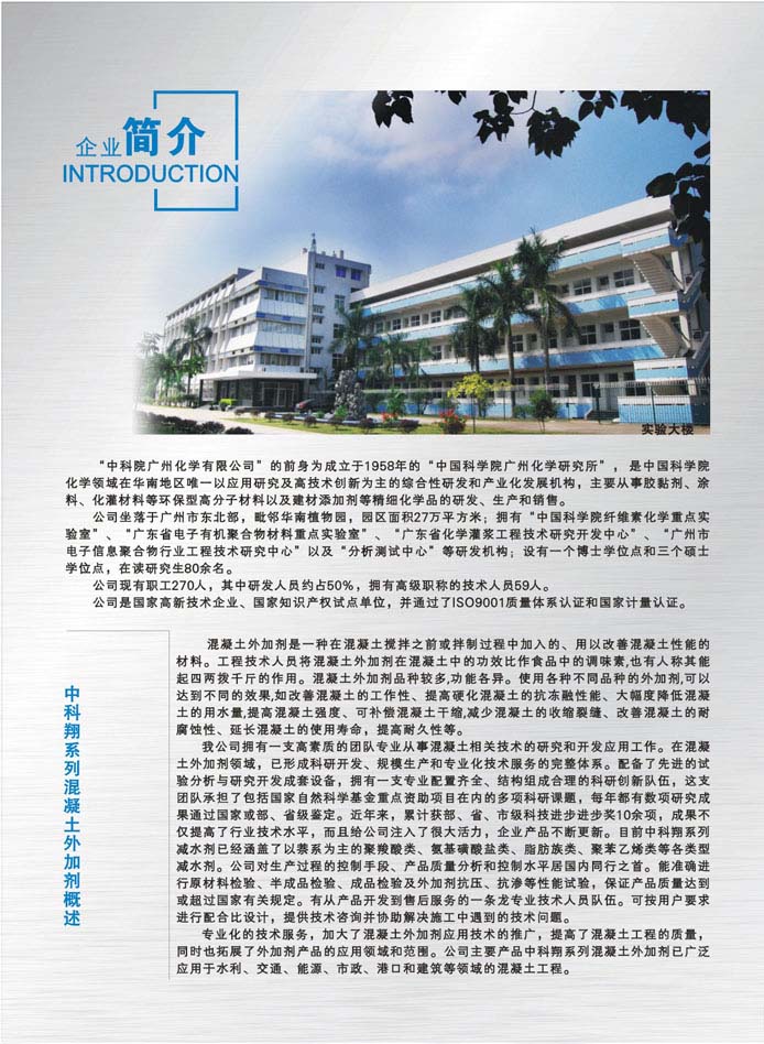中科化学是集科研、研究生教育、绿色化工和新材料产品生产与销售、化工产品技术检测以及化工行业高新技术服务于一体的大型国家高新技术企业,为国家知识产权试点单位,拥有两家子公司:中科院广州化灌工程有限公司(国家高新技术企业)和广州中科检测技术服务有限公司。