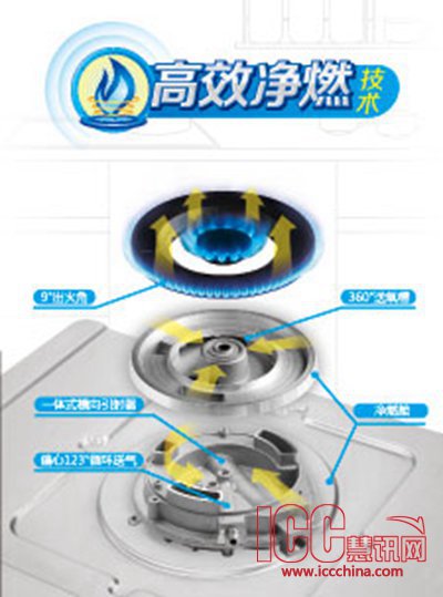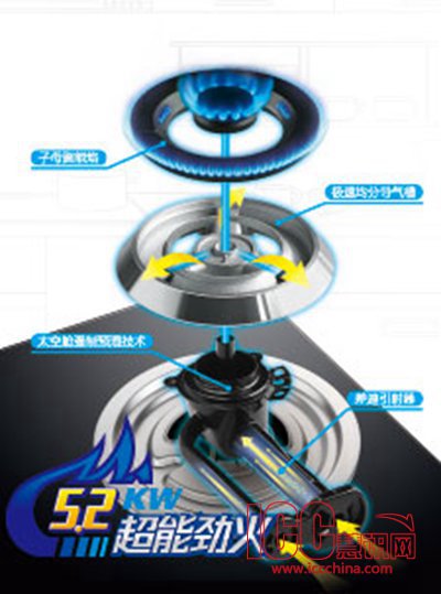 在引射管与燃烧器之间加装了专利空气强制预混腔,克服传统自然混气燃烧不充分的弊病,让燃气与空气均衡混合,更容易达成高效热能转化,同时大大降低了废弃排放,即节能燃气,又保证厨房空气洁净。