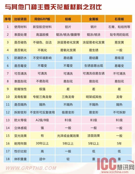 随着国家经济实力的增强,人民生活水平的提高,“绿色建筑”的理念越来越得到人们的认可。针对各种建筑场所建设过程中使用的装饰材料,也提出的了更多的关于绿色、环保、节能、节材等要求。目前建筑装修使用的材料繁杂,种类众多,但是在天花吊顶的领域,市场上现有的天花板还存在不少的问题,需要我们进一步的的重视和深入的研究。而GRP天花板作为一种新型的环保的吊顶材料,从材料等角度非常契合绿色建筑的理念,后续将在建筑材料领域有非常大的发展空间。