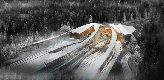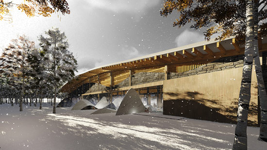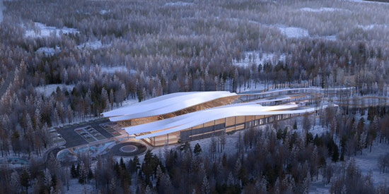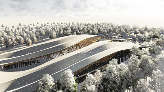 设计的初衷为尽量保持场地森林以及河流的独特性,希望建筑与景观能够以低调的方式存在于场地当中。因此,设计师以“森林中的云雾”为概念,通过几组流线型的屋顶在平面中延展,以一种纯净的姿态落到场地当中,力求云雾的意象能够和长白山的森林、冰雪形成呼应,让建筑与周边环境融为一体。