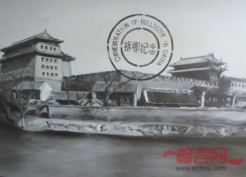 展览展出的是王明贤和朱锫的当代艺术作品和建筑作品。王明贤油画作品名为“拆哪纪念”,系多年来研究建筑史和艺术史的工作成果。在当代艺术的语境中,对北京消失的城墙的描绘,拆哪纪念(COMMEMORATION OF BULLDOZER IN CHINA)邮戳的运用,使“城市与记忆”、“城市与欲望”、“城市与符号”有了新的解读,形成历史和现实的对话;表面上看城市风景令人思怀古之幽情,“无论哪一个巍峨的古城楼,或一角倾颓的殿基的灵魂里,无形中都在诉说,乃至于歌唱,时间上漫不可信的变迁。”隐藏在背后的则是社会发展史和艺术史错综复杂的结构线索,同时反映出中国的都市化进程与当代艺术之间的关系。