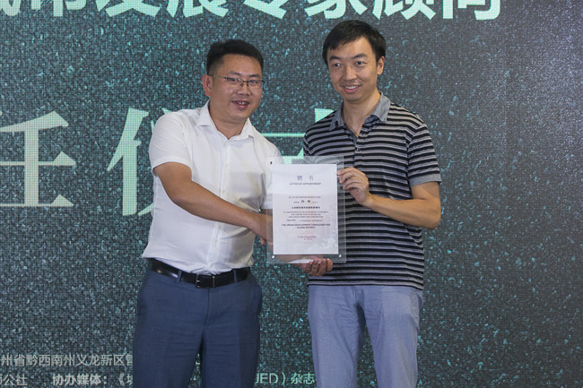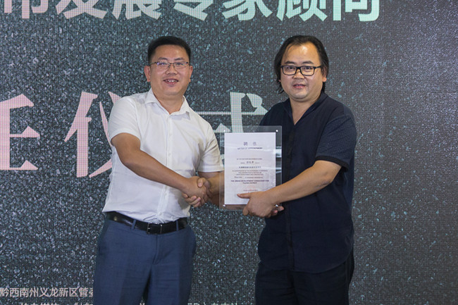 义龙新区党工委副书记、管委会副主任潘维维为清华大学建筑设计研究院副总建筑师祁斌颁发聘书