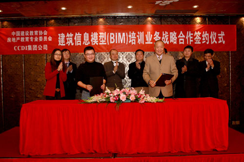 2012年3月8日上午,中国建设教育协会房地产教育专业委员会(以下简称“协会”)与CCDI集团公司关于“建筑信息模型(BIM)培训业务战略合作”的签约仪式在北京隆重举行。