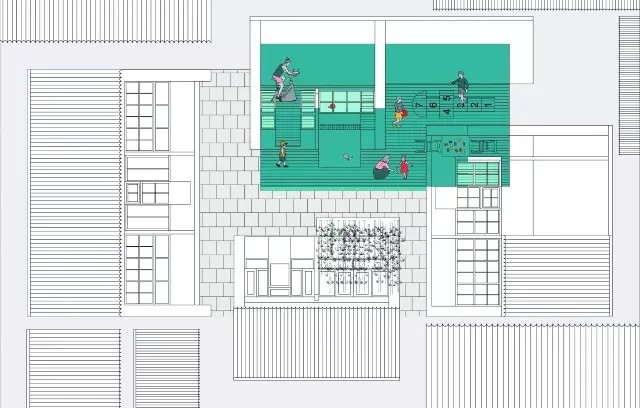 现有空间是由几栋低矮的房屋合围着天井组成的。新的综合空间还汲取了庭院建筑的优点,使人在这里担当了主要角色:构成一个抽象的体量,通过涂绘表面来表现边界:包括原始建筑内部与一部分室外空间。此地将会成为一个社交点,拉近人与人间的距离。通过这种方式,将公共空间的活力注入到私人空间之内,重新定义了传统意义上的公共与私人的界限。