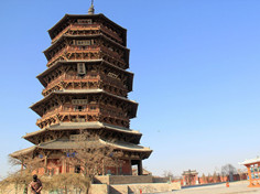 山西应县释迦塔,俗称应县木塔,建于辽清宁二年(1056),金明昌六年(1195)增修完毕。释迦塔塔高67.13米,底层直径为30米,平面为八角形,五层六檐;外观是五层,但是塔内夹有暗层四级,实为九层;全塔耗材红松木料3000立方米,2600多吨,纯木结构、无钉无铆,塔内供奉着两颗释迦牟尼佛牙。这座凝聚了古代匠师聪明才智和精湛工艺的木塔历经了千年风雨、多次地震甚至战争炮火的考验,仍屹立至今,堪称建筑史上的奇迹。