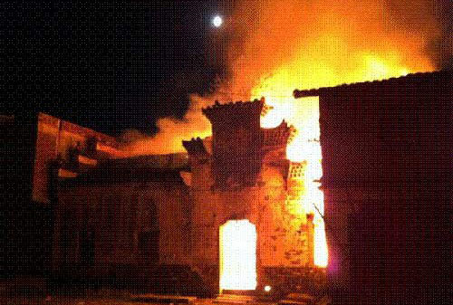 站在旁边一栋楼上,看到古宅东北角二楼的三间房屋几乎烧成了废墟,屋顶已大面积坍塌,古宅一楼也受灾严重。消防人员赶到现场,大约半小时后将火势控制住。