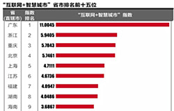 中西部地区也有黑马。“互联网+智慧城市”指数的前10省区市排名中,中西部占据3席,重庆、湖南、四川分列第3、8和10位。