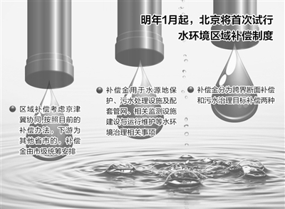 日前,北京市政府常务会原则通过《北京市水环境区域补偿办法(试行)》。按照这一办法,从明年1月起,北京将首次试行水环境区域补偿制度:向下游区县排水水质不达标或比上游来水水质变差一个水质功能类别的区县,将按照每个断面每月30万元的标准对下游区县予以补偿,用于下游区县水源地保护和水环境治理项目建设。