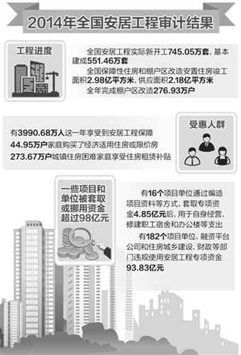 审计署发布的2014年城镇保障性安居工程跟踪审计结果公告显示,去年全国安居工程取得了显著的经济社会效益,但也存在部分项目单位套取或挪用安居工程专项资金等问题。针对这些问题,要加强整改,提高资金管理水平,增强住房分配透明度—