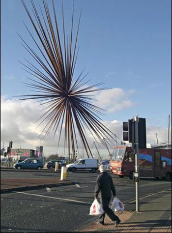 上图是赫斯维克为在曼彻斯特2002年英联邦运动会设计的“钢穗”雕塑,高56米,由180根细长的钢管组成。其倾斜度为意大利比萨斜塔的10倍以上。(图片来源:863p.com)