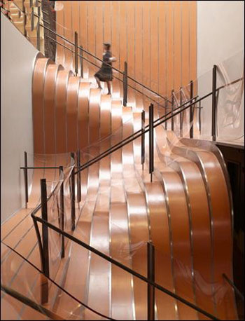 上图为赫斯维克设计的位于纽约苏荷区(SoHo)法国时尚品牌皮革制品公司Longchamp的主力商店的“飘浮”楼梯。(图片来源:863p.com)
