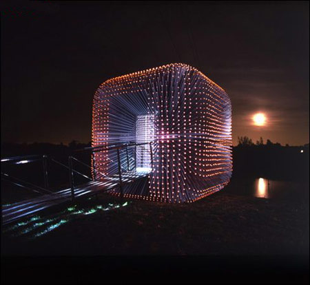 上图是赫斯维克为国家罗盘星收藏协会(National Malus Collection)设计的发光的铝质结构小屋“赛图特里”(Sitooterie)。这个立方体的建筑有5,000个小窗户,它们都朝向这个立方体的中心。中心的一个光源使这些窗户发出橙色的光芒。(图片来源:863p.com)